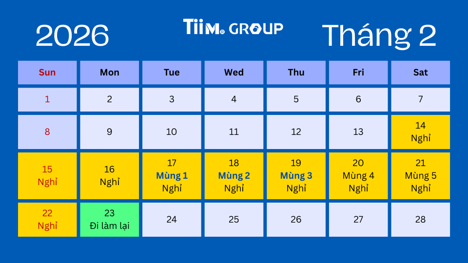 📢 Nghỉ lễ Tết Nguyên Đán Bính Ngọ 2026: Nghỉ từ Thứ Bảy ngày 14/02/2026 (27 Tháng Chạp) đến hết Chủ Nhật ngày 22/02/2026 (Mùng 6 Tết). Trở lại làm việc bình thường vào Thứ Hai ngày 23/02/2026 (Mùng 7 Tết).